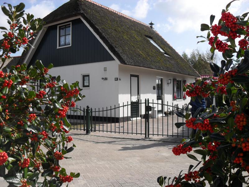 Een vorstelijke tuin met buitentafel 6 stoelen en 2 en een parasol (bijkeuken). De terrasstoelen en voetenbankjes kunnen in een bergkast achter de schuur opgeborgen zijn/worden. En er staat een Weber BBQ in de bijkeuken. Het is verboden de BBQ onder de rieten dakrand te gebruiken (brandgevaar) en deze schoon achter te laten. Parasol opbergen na uw verblijf in de bijkeuken.